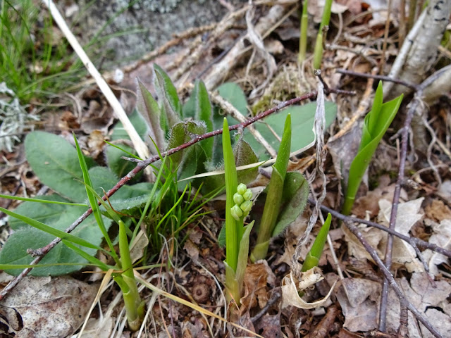 När hunden och jag gick över kullen, upptäckte jag några gröna spjut vid kanten på stigen. Det fanns inga knoppar än där, men längs grusvägen hittade jag några små, små knoppar av liljekonvaljer. Nu är de också på gång. Vi har en underbar tid framför oss.